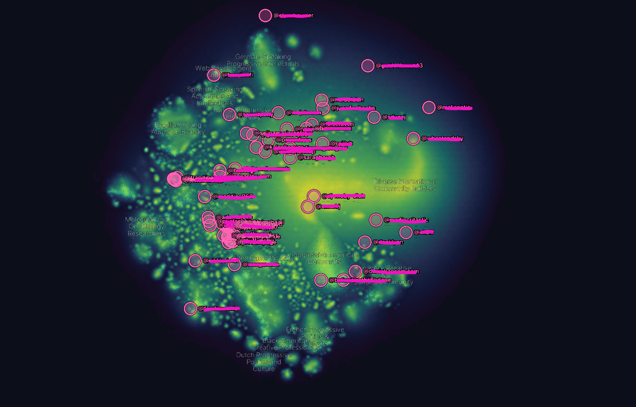 Viral pathogen genome researcher, Theo Sanderson, has created a map of 3million+ Bluesky users that visualizes simple, publicly available user data, and it's exquisite.