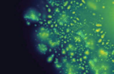 Two screenshots showing a zoomed-in view of the glowing regions comprised of individual user nodes. The left image is very zoomed-in, the right is fully zoomed-out.