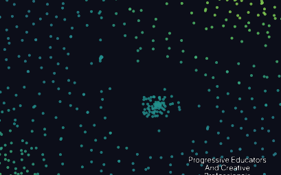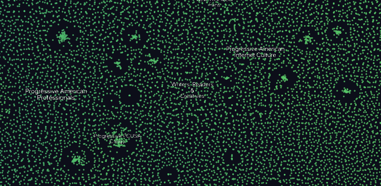 And that thing that looks like a cyst? It's so wild – that's "Progressive American Democrats" and the accounts within all share extremely similar content – which is why it's such a well-formed shape. And like, the entire map is progressive and "left"-identifying, so what sets the Progressive American Democrats apart (not to be confused with the American Democratic Progressives, or The People's Front of Judea), is the conformity of the content. So wild to see it as a literal bubble. It would make sense that an effect of ideology would be smoother definition. It made me reflect on how many voices from that bubble I actually need in my feed if they're all saying the same thing. Not that I don't want to hear that perspective, but I just don't need it on repeat drowning out the other signals.