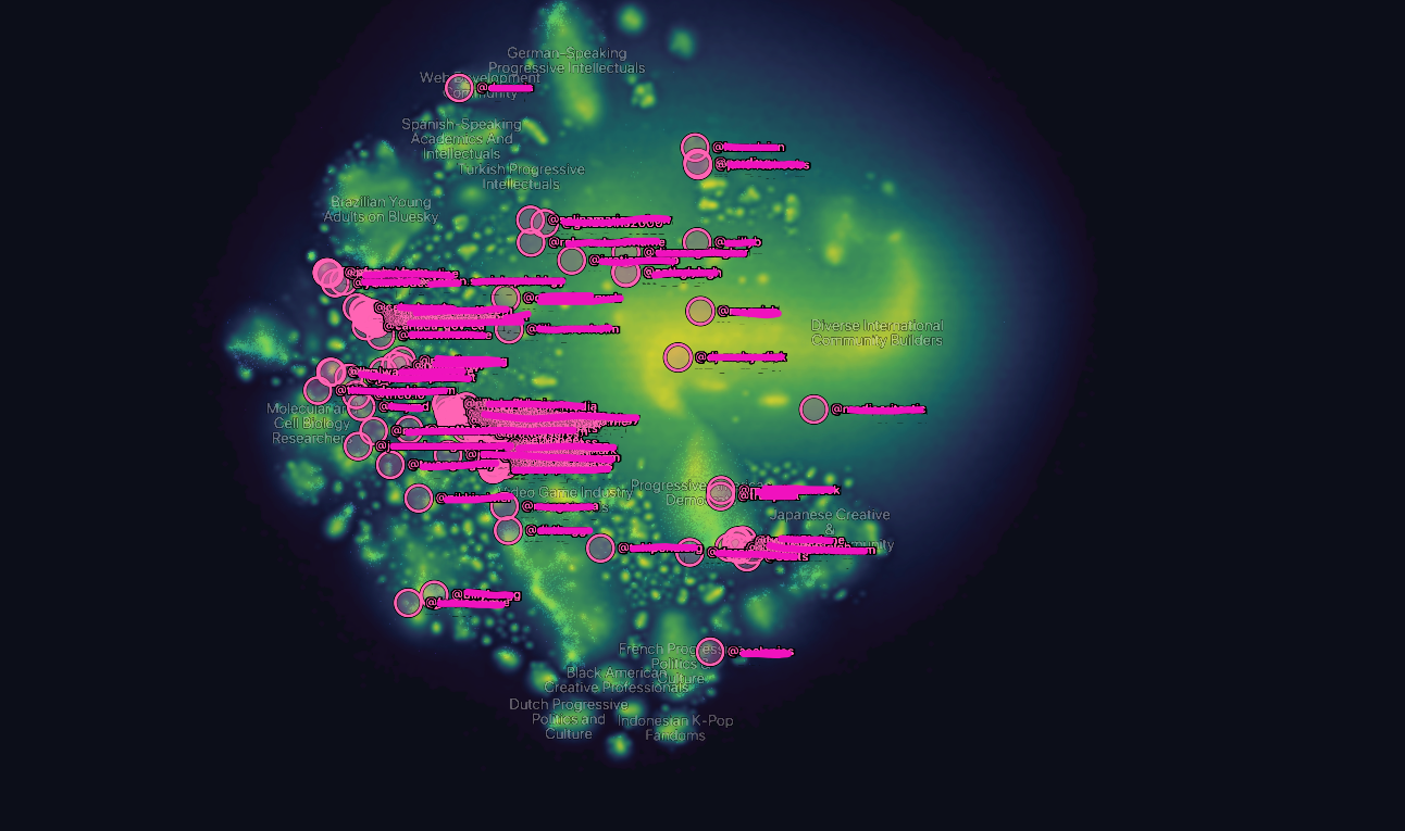 Zoomed-out, the bubbles are nebulas of commonalities – Theo's LLM pulled from user bios to generate community labels that consolidated them into shared interests and identities. It seems conformity is actually pretty easy to measure through data, so those nebulas are likely quite conformist within their cultural boundaries. I find this so interesting.